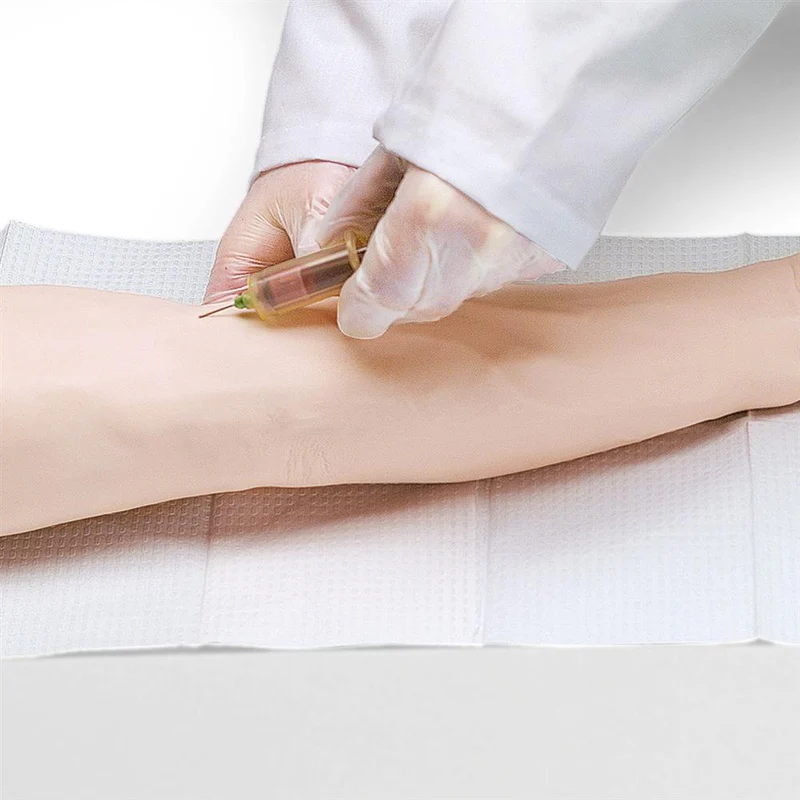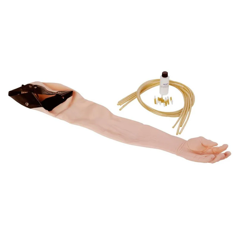 La venopunción también puede realizarse a lo largo de las venas basílica, cefálica, cefálica accesoria y antebraquial media. Las inyecciones intramusculares pueden realizarse en el músculo deltoides, y los puntos de inyección intradérmica se encuentran en la parte superior del brazo. Las inyecciones intramusculares en el deltoides se ven realzadas por la piel suave y realista y las marcas óseas naturales de la región. Las inyecciones intradérmicas con agua destilada crearán ronchas cutáneas características en los puntos designados del brazo.