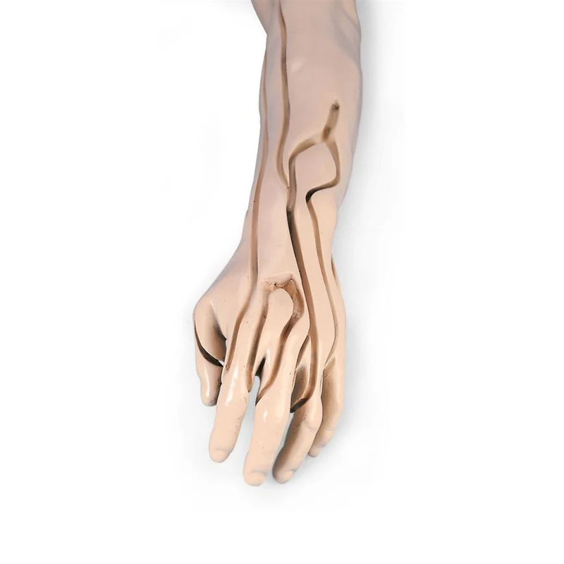 El realismo del Brazo Avanzado de Venopunción e Inyección Life/form® es realmente asombroso. Los dedos, suaves y flexibles, se moldean por separado con extrema atención a cada detalle, ¡incluso a las huellas dactilares! La flexión de la muñeca ayuda a los estudiantes a desarrollar habilidades de manipulación. La piel reemplazable se enrolla al palpar las venas y se siente un «pop» perceptible al entrar en ellas. El proceso de moldeado de Life/form® reproduce los detalles finos de la piel para que el brazo parezca y se sienta vivo. Las válvulas de las venas se pueden ver y palpar en la superficie de la piel. Las venas y la piel simuladas son completamente reemplazables para que este brazo de entrenamiento se vea y funcione como nuevo.